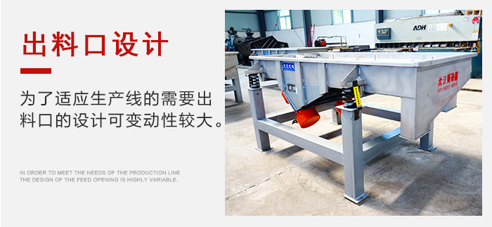 (2)多層直線振動篩出料口的設計可變動性較大,一切為了適應生產(chǎn)線的需要。例如多層直線振動篩的出料口的形狀有圓形的、方形的;出料口的伸縮方向可以設計成向前伸、向下伸、傾斜向下伸等。