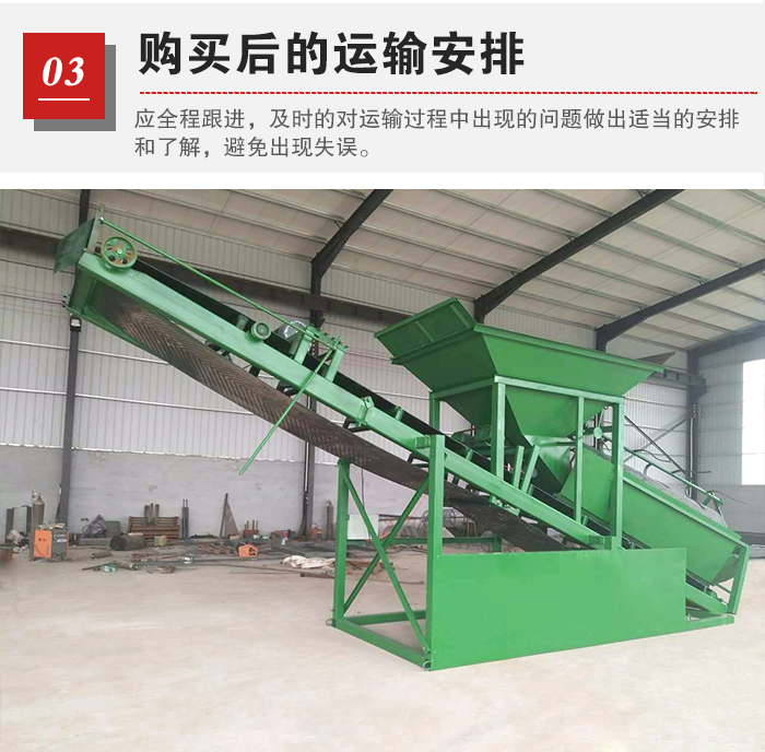 篩沙機(jī)在采購(gòu)?fù)戤吅?,廠家會(huì)在設(shè)備完成后進(jìn)行運(yùn)輸發(fā)貨,此時(shí),用戶(hù)應(yīng)全程跟進(jìn),及時(shí)的對(duì)運(yùn)輸過(guò)程中出現(xiàn)的問(wèn)題做出適當(dāng)?shù)陌才藕土私?,避免廠家出現(xiàn)失誤,出現(xiàn)小配件漏發(fā)等問(wèn)題。