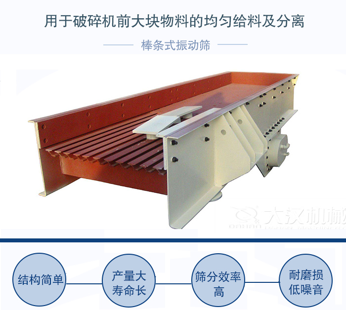 BTS棒條式振動篩用于破碎機(jī)前大塊物料的均勻給料及分離,棒條式振動篩特別適用于水電行業(yè)、建筑石料及黑色或有色金屬、礦石粗破前給料和初篩;棒條式振動篩振動給料機(jī)采用振動電機(jī)為激振源,結(jié)構(gòu)簡單、維護(hù)方便;產(chǎn)量大,壽命長,結(jié)實耐用。