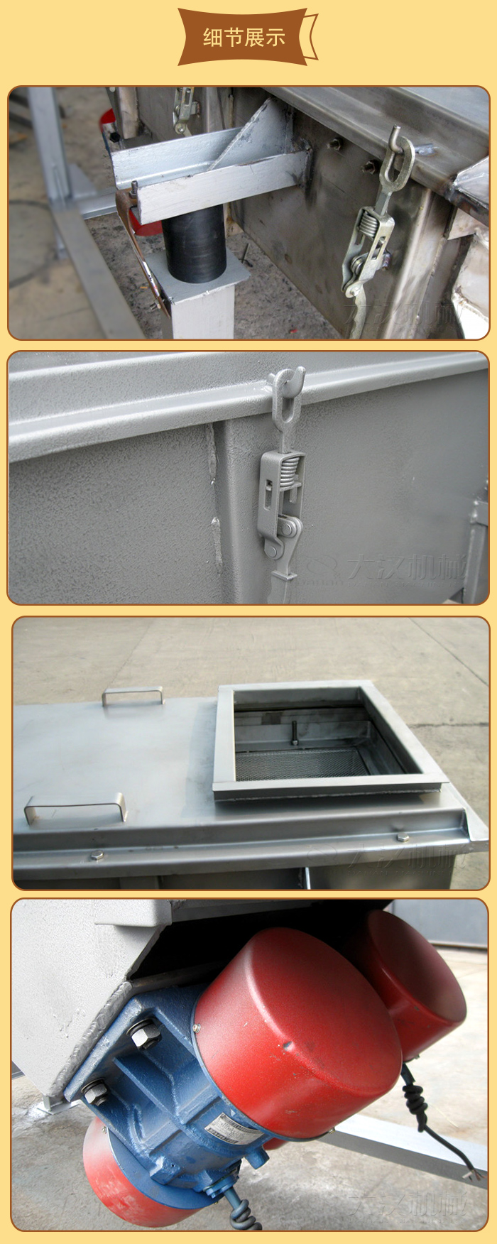 1、篩箱:由數(shù)種厚度不同的鋼板焊制而成,具有一定的強度和剛度,是篩機的主要組成部分。