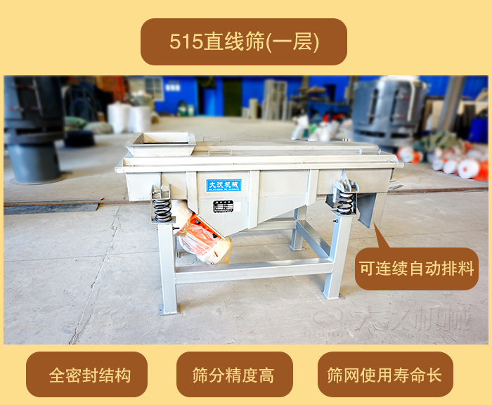DZSF-515直線篩(寬)500mm×1500mm(長),體積小移動方便,價格便宜。大漢直線振動篩廠家可為客戶量身定做特殊要求的直線振動篩(單層或多層)。515直線振動篩按材質(zhì)分為304不銹鋼材質(zhì)和碳鋼材質(zhì)。