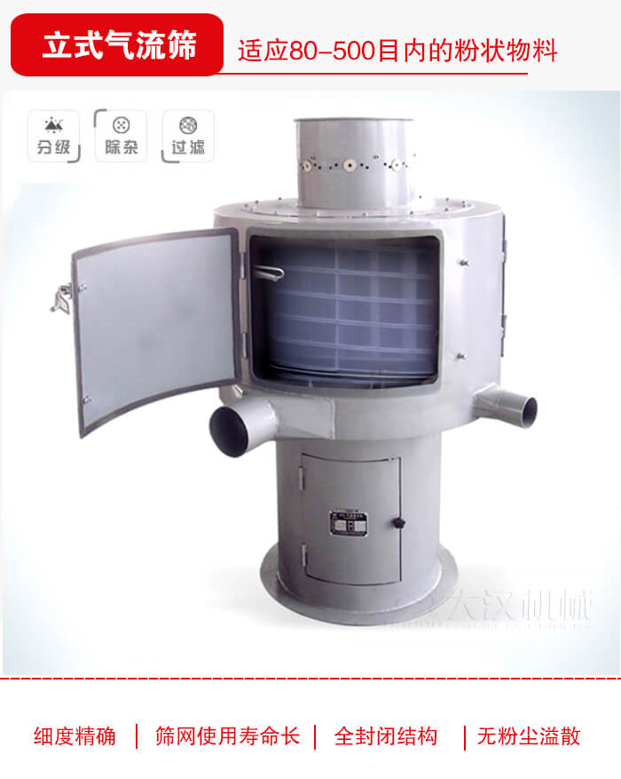 氣流篩又稱立式氣流篩主要借助風(fēng)機(jī)的風(fēng)力帶動(dòng)物料投向篩網(wǎng)從而實(shí)現(xiàn)物料的篩分,主要范圍在80-500目的粉狀物料進(jìn)行過(guò)網(wǎng),篩網(wǎng)立裝不荷重,全封閉結(jié)構(gòu),無(wú)粉塵溢散,氣流篩型號(hào)有LQS600、LQS1000、LQS1600等常規(guī)型號(hào)。