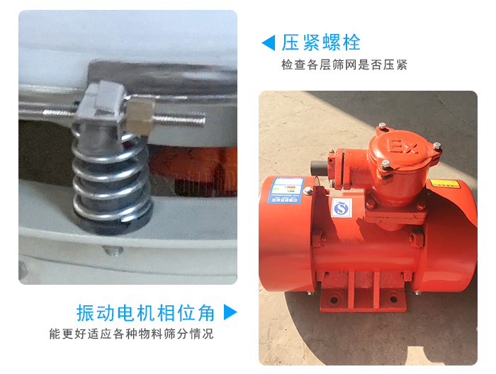 ⑸調(diào)節(jié)振動電機上下偏心塊的相位角,以適應各種物料篩分情況。
